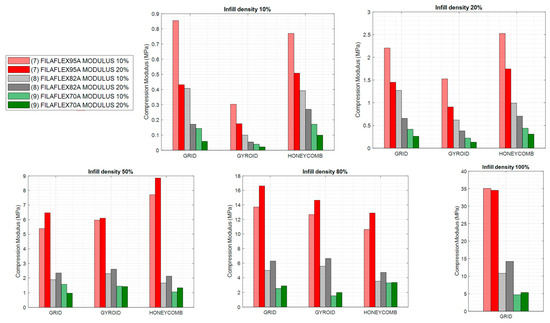 Compression modulus at 10% and 20% of deformation measured for specimens fabricated with Filaflex with different hardness (95 A, 82 A and 70 A). The measured specimens were fabricated with variable infill density and three different patterns (grid, gyroid and honeycomb).