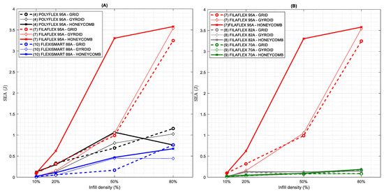 Specific Energy Absorption at 4th cycle as a function of the infill density. (A) TPUs with similar Shore harness: Filaflex 95 A, Polyflex 95 A and FlexiSmart 88 A, (B) Filaflex with different hardness: 95 A, 82 A and 70 A.