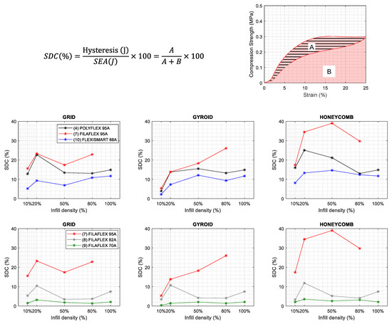 The specific damping capacity (SDC) of a structure is a constant value that provides the recovery capacity to the initial state. The SDC can be calculated from the ratio of dissipated energy (load-unload) to stored energy (load) following the equation shown in Figure 13. Hence, a higher SDC implies higher load-unload difference, so higher hysteresis and higher damping capacity [55]. In Figure 13, the SDC values are represented as a function of the infill density for the different materials selected and the three types of infill.