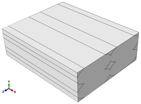 The geometry followed the observations under the microscope. The dimensions were obtained by analyzing the section image of the specimen. It was decided to consider a single unit of length for the “Z” direction. The schematization of the printed lines was made considering an ellipsoidal section, while the contact areas were defined as continuous between adjacent lines and adjacent layers. Figure 4 shows that four lines were chosen in the definition of the RVE.