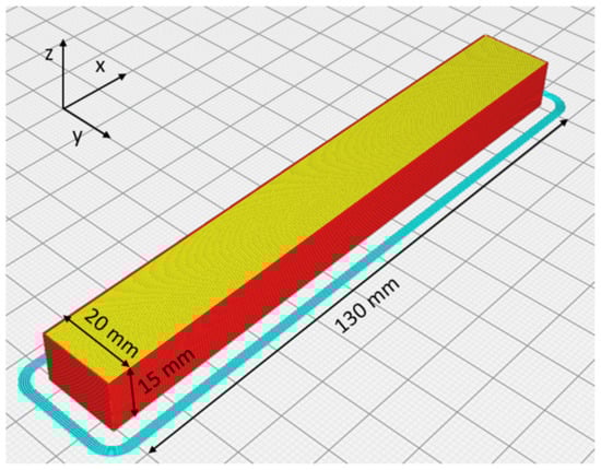 The specimens were made with an E3D Tool-changer 3D printer, and the toolpath (G-Code) was obtained using Cura 4.9.1 (Ultrecht, The Netherlands) free slicing software.