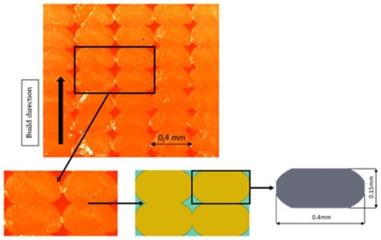 The specimen microstructure was obtained using an optical microscope with a 20× magnification. The specimen must be long enough to allow the printing speed and extrusion rate to stabilize. To simplify the geometry of the RVE model, the specimen must be printed with lines parallel to the largest dimension of the specimen, as shown in Figure 2, in order to be able to clearly and uniquely highlight the microstructure, once broken at 90° with respect to the largest dimension. The choice of creating a parallel line RVE model is dependent by the following reasons: