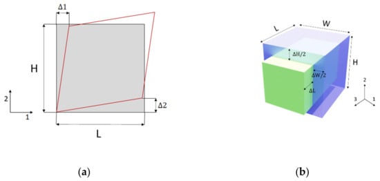 (a) Deformed part schematization of displacement to evaluate G12; (b) 3D schematization of the load case to evaluate E11 and Poisson’s ratios ν12 and ν13.
