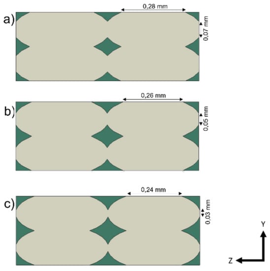 Increased RVE void length dimensions in Y and Z directions, respectively: (a) lengths of 0.07 and 0.28 mm; (b) lengths of 0.05 and 0.26 mm; (c) lengths of 0.03 and 0.24 mm.