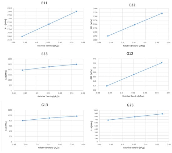 Such reductions could be demonstrated by using the methodology proposed by Patrich et al. []. However, the variations of Young’s modulus and the Shear modulus values with respect to the relative density could be seen from the graphs reported in Figure 9. The data are shown in a similar manner as the reported research on a foam-like material by Imwinkelried [] and Goods et al. [], as the values increased in a linear way.