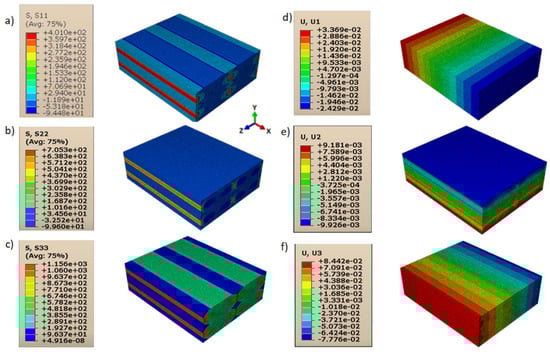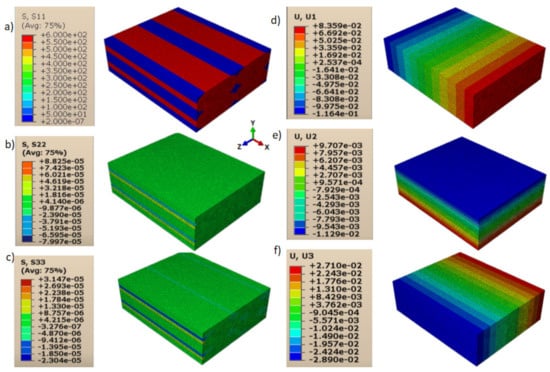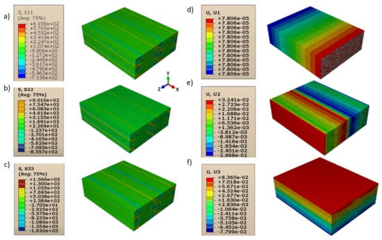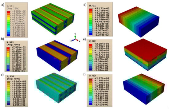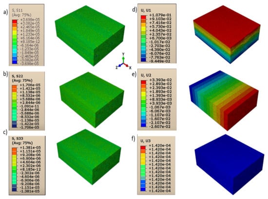 Consequently, shear moduli G12, G13, and G23 were reduced compared to those in the case of a homogeneous isotropic material and strictly depended on the contact behavior between layers and lines. The displacements and directional stresses of all the load cases to show the symmetric behavior of the RVE are reported in Figure 10, Figure 11, Figure 12, Figure 13, Figure 14 and Figure 15.