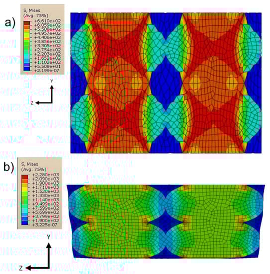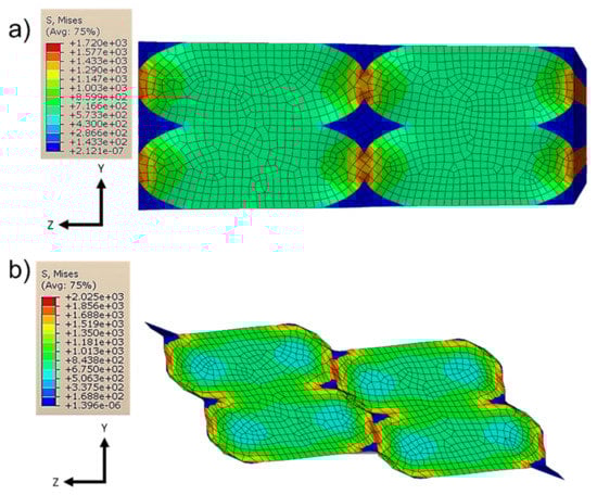 Moreover, the values of the “Air” material were assumed from the Ansys database, and they had no structural meaning in the simulation. The influence of this material on the mechanical behavior of the structure was in fact irrelevant. It could have a nonzero influence in the case of the thermal analysis of cooling or heating of the component being air as an insulating material. However, this analysis is beyond the scope of this study, and therefore for the simplicity and clarity, the “air” material was considered “linear elastic” to maintain compatibility in the simulation. The air material results, however, were mandatory to perform the RVE analysis, since the calculation of the various modules was weighed on the lateral area of the RVE. Therefore, for the simplicity of calculation of the software, it is a good practice to keep a parallelepipedal shape.