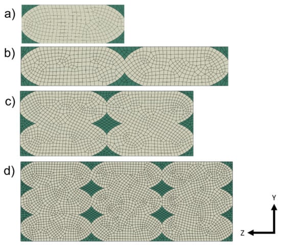 Different RVE dimensions given by number of printed lines used to evaluate the effect of the size influence. (a) one line;(b) two lines; (c) four lines;(d) nine lines.