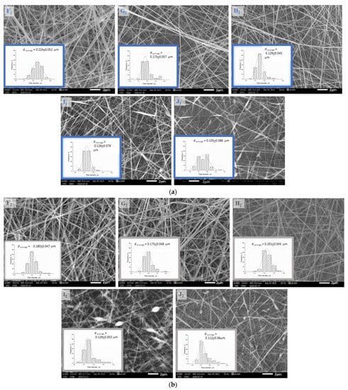 Regarding the SEM images, it can be seen that the average fiber diameter of native and heat-treated samples (F1,2, G1,2, H1,2, I1,2, J1,2) decreased with increasing chitosan and citric acid content from F to I. The full-width values (Table 3) of distribution curves followed a minimum curve in the case of native samples, and decreased with increasing chitosan and citric acid content in the case of heat-treated samples.