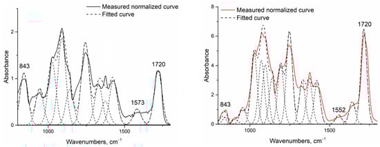 Fourier-transform infrared spectroscopy [31,39] was conducted to identify the cross-linking reaction between chitosan and PVA initiated by the addition of citric acid and heat treatment. Assuming that this reaction also begins without heating, the native fiber’s infrared spectra were investigated and then compared to heat-treated fibers. As the investigated system was very complex, and the presence of water could not be avoided, only increases in the two peaks related to cross-linkage by citric acid were investigated: one related to the amide II group around 1550 cm−1 (associated with the N-H bending vibration bond of amide II aromatic nitro compounds), and one related to the developed ester bond around 1720 cm−1 (Table 6). To make them comparable, the spectra were normalized to the 843 cm−1 peak related to the aromatic C-H in-plane and out-of-plane bending and the vinyl C-H out-of-plane bonds, and were deconvoluted into peaks using OriginPro software.