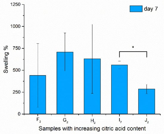 Swelling properties of the samples after being immersed in water for 7 days (due to high standard deviation, no significance was found at p > 0.1, but I2–J2 are indicated with *).