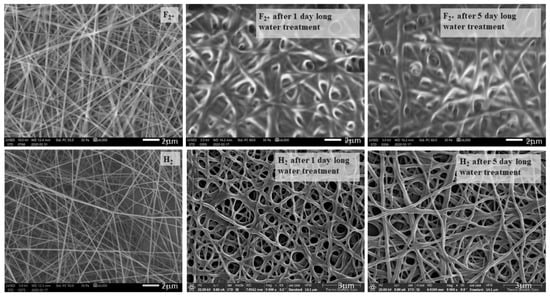 As the native PVA-containing samples’ structure decomposed during contact angle measurements, preliminary experiments of structure changes for cell viability were performed in order to prove that the structure of heat-treated samples can resist water for the adequate length of time. Therefore, the samples F2* (heat-treated PVA, * means: added citric acid to promote cross-linkage, as pure PVA dissolves immediately in water) and H2 (the one containing 1.3 m/m% chitosan with fiber-like structure) were immersed in distilled water for 1–5 days, and SEM images were taken in order to see whether the samples dissolved in water or not, and to study their structural changes. The SEM images showing this can be seen in Figure 8.