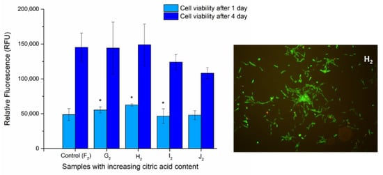 The viability of DPSC cells on the surface of UV-treated fiber-covered glass coverslips was determined via Alamar Blue assay after 1 and 4 days to examine the biocompatibility of the samples. We aimed to determine whether the optimized polymer mixture’s components have any effect on the viability or proliferation of the cells grown on the heat-treated fiber net (samples F2 to J2). The viability of the cells grown on the G2, H2, and I2 chitosan-containing fiber-covered coverslips changed slightly but significantly (Figure 9) after 1 day of incubation, while on sample J2 it was unchanged compared to the control (F2, PVA). After 4 days, however, none of the chitosan-containing samples caused significant alterations in the cell viability.