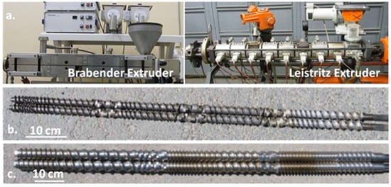 The lab-scale extruders used in the tests (a); screw profiles of the Brabender (b) and Leistritz (c) extruders.