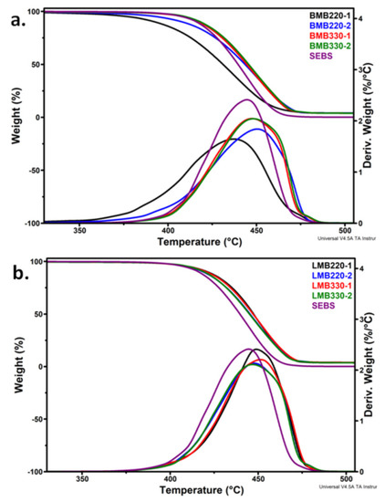 The difference between BMB220-1 and BMB220-2 was determined by the different temperature profile in the plasticization zone, with about 10 °C lower in the case of the first sample. This means an increased melt viscosity in this case and, therefore, more shear resulting in local rise in temperature and further chain breakage. Indeed, the torque values measured by the Brabender WinExt software during extrusion, 78 Nm for BMB220-1 and 74 Nm for BMB220-2, indicated a higher melt viscosity for the first sample, which is prone to degradation. Contrarily, the combination of a higher length with a lower residence time in the Leistritz extruder and the milder shearing provided by its screw profile led to an increased thermal stability in this case. This may be also associated with better nanoclay dispersion and interaction between components. The best thermal stability was noticed for LMB330-1, which showed an increase of the Tmax with about 7 °C compared with neat SEBS.