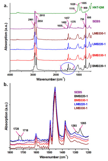 The differences in thermal stability between BMB220-1, the masterbatch processed in the Brabender extruder with a lower screw rotation speed at a lower temperature and the rest of the samples may result from thermo-oxidative degradation processes. Therefore, HNT-QM, SEBS and all the masterbatches obtained under the first temperature profile condition were investigated by FTIR, and the spectra are presented in Figure 3a.