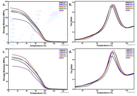 In the case of the Leistritz processed samples, only those obtained with a higher screw speed showed increased Tg values. The highest increase was obtained for LMB330-2, processed under the harsher conditions of the Leistritz. These two samples, LMB330-1 and LMB330-2, also showed the highest E′100 values and higher storage modulus for a wide range of temperature (Figure 4c). These differences result from the different mixing conditions ensured by the two extruders, the more severe ones in the case of the Brabender extruder.