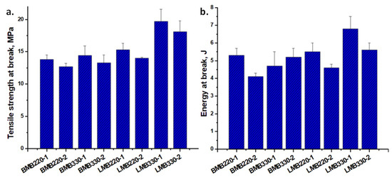 The same rule was noticed for the energy at break, higher values being obtained for the lower temperature profile in the case of the masterbatches processed in the Leistritz and no clear variation for those processed in the Brabender. The highest tensile strength and energy at break values were obtained for the LMB330-1 masterbatch, processed with a higher screw speed and a lower temperature profile, which also showed the best storage modulus and the best thermal stability.