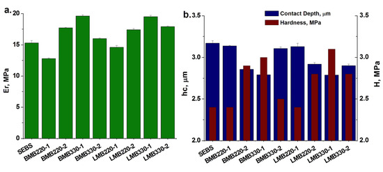 Nanoindentation tests were also carried out on SEBS/HNT-QM masterbatches due to the great importance of the surface properties in automotive applications. The variation of Er and H for masterbatches in comparison with SEBS is presented in Figure 6. A similar trend was observed for the Er values measured by nanomechanical test (Figure 6a) and E′ measured by DMA (Figure 4a,c), namely, an increased modulus for the masterbatches processed at high speed and low temperature profile. The highest increases in Er (of about 28%) compared to SEBS were obtained for the masterbatches processed at 330 rpm and low temperature, in both Brabender and Leistritz (BMB330-1and LMB330-1). The lowest value was obtained for BMB220-1, the masterbatch processed at 220 rpm and low temperature, which also showed the most intense degradation during processing.