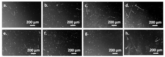 SEM images of masterbatches obtained with the two extruders: BMB220-1 (a), BMB220-2 (b), BMB330-1 (c), BMB330-2 (d), LMB220-1 (e), LMB220-2 (f), LMB330-1 (g), LMB330-2 (h).