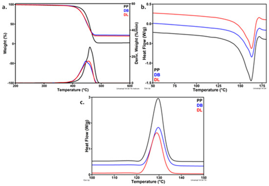 The effect of masterbatch quality on the properties of a PP hybrid composite was studied by diluting the selected masterbatches, BMB220-1 and LMB330-1, in a PP/GF composite also containing MAPP, according to a manufacturing recipe for automotive parts [30]. The Leistritz LSM 30.34 co-rotating twin-screw extruder was used for the dilution due to its mild configuration, which protects GF from severe breaking. The thermal properties of hybrid composites obtained by dilution of BMB220-1 and LMB330-1, denoted as DB and DL, were compared to those of the original PP (Figure 9).