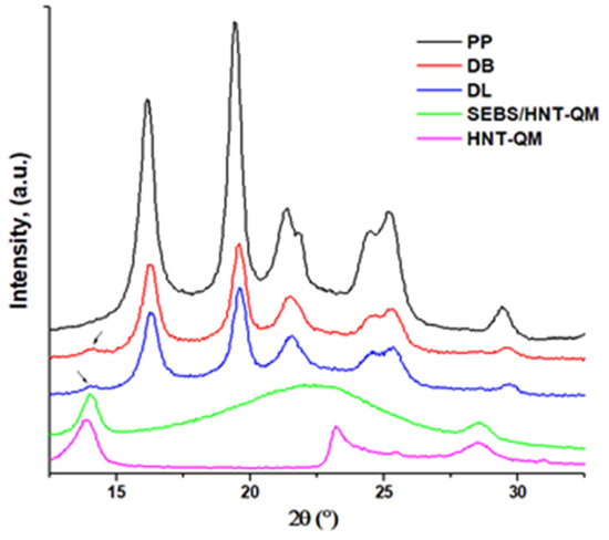 XRD analysis of PP, HNT-QM, LMB330-1 masterbatch and hybrid composites (DB and DL) was performed on a DRON-UM X-ray diffractometer (horizontal goniometer–Bragg–Brentano geometry–reflexion mode) using Co Kα radiation with λ = 1.79021 Å. The samples were scanned at 0.05°/4 s from the 2θ value of 4° to 50°. Specimens for XRD analysis were taken from masterbatch plates 1.2 mm in thickness and 30 mm in diameter and from composites injection-molded bars of 4 mm in thickness and with a surface of 20 × 20 mm. The d spacing (d) was calculated using the Bragg equation: d = λ/(2 sinθmax).