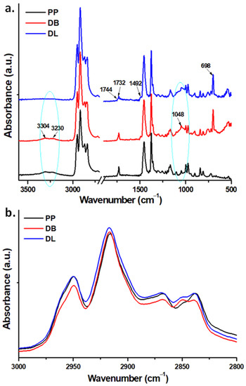 An important zone of the PP composites spectra is found at 2960–2830 cm−1, where the peaks are sensible to interactions of additives with PP. In detail, the peak at 2959 cm−1 is attributed to C–H asymmetric stretching in CH3 (in-skeletal plane), the peak at 2950 cm−1 to C–H asymmetric stretching in CH3 (out-of-skeletal plane), the peak at 2917 cm−1 to C-H asymmetric stretching in CH2, the peak at 2868 cm−1 to C–H symmetric stretching in CH3, the peak at 2850 cm−1 to C–H symmetric stretching in CH2 and the peak at 2838 cm−1 to C–H stretching in CH [48] (Figure 11b). Several differences were observed between the spectra of DB and DL in this region (Figure 11b). Variations in the intensity of the peaks in the region 2960–2830 cm−1 can be used as indicative for PP-SEBS interactions, especially due to a lower depth of light penetration on the ATR-FTIR, of about only 0.66 µm at 3000 cm−1. The higher intensities of all the peaks recorded for DL compared to DB in the analyzed region suggest the presence on the surface of DL of a certain amount of SEBS dissolved or co-crystallized with PP. This can be interpreted as a better compatibility and homogeneity of components (SEBS and PP) in DL compared with DB.