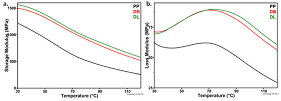A relaxation process (α-transition) was observed around 70 °C in all the samples (Figure 12b). This is associated to the molecular motion of the PP chains in the crystalline phase [49]. The E″ peak was wider and shifted to a higher temperature in PP hybrid composites compared to neat PP (Figure 12b): 70.7 °C for DB and 73.8 °C for DL compared to 67.9 °C for PP. This supports the stronger interactions among the components which restricts the polymer chains mobility in DL composite [49,50]. This is consistent with the higher values obtained for the modulus of elasticity and impact strength of DL (Table 6).