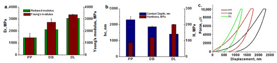 Reduced modulus vs. Young’s modulus (a) hardness (b) and load–displacement plots (c) for PP and PP hybrid composites obtained from selected masterbatches.