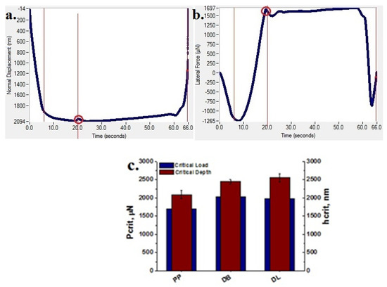 Representative plots of normal displacement and lateral force versus time, generated by the TriboScan software from 5000 μN ramping force nanoscratch tests, are shown in Figure 14a,b. Critical events, defined as critical load (Pcrit) and critical depth (hcrit), were identified from these data plots. They correspond to changes in the displacement/lateral force curves (circled in Figure 14a,b).