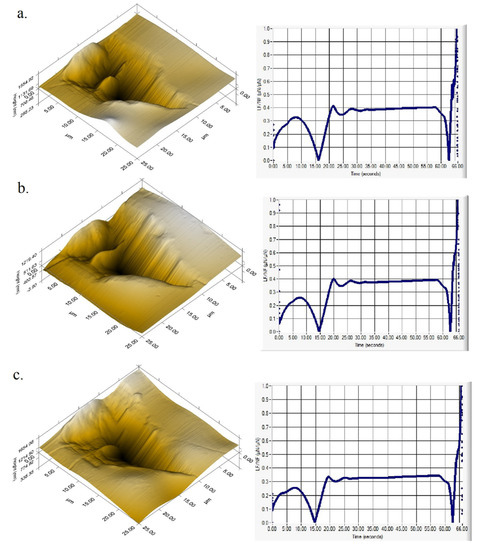 These results are consistent with the roughness and friction parameters measured on the surface of hybrid composites and PP: root mean square (RMS) roughness (Rq), coefficient of friction (µ), scratch depth (SD) and scratch pile-up. The height of the pile-up formed during the scratching of the samples’ surface depends on the hardness and elastic modulus of the sample: the higher the hardness and the elastic modulus of the sample, the lower is the pile-up [51]. The 3-D topographical in situ SPM images and the values of Rq, μ, SD and scratch pile-up (rear pile-up) for PP and PP hybrid composites are presented in Figure 15 and Table 7.