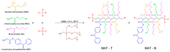 Two groups of MATs with different telogens, i.e., tetrabromomethane (TBM) and bromotrichloromethane (BTChM), were obtained via a thermally initiated telomerization process. The products (the MAT solutions in the epoxy diluent, 80/20 m/m) contained built-in epoxy (from GMA), hydroxyl (from HEA), and photoreactive benzophenone groups (from ABP) as well as the terminal halogen atoms Br (MAT-T with TBM) or Br and Cl (MAT-B with BTChM); the theoretical structures of the MATs are presented in Figure 1. Values of the dynamic viscosity and volatile mater content for the MAT solutions are presented in Table 2.
