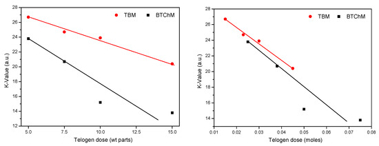 K-values of multifunctional acrylic telomer solutions in relation to the type and dose (by weight or moles) of the telogens.
