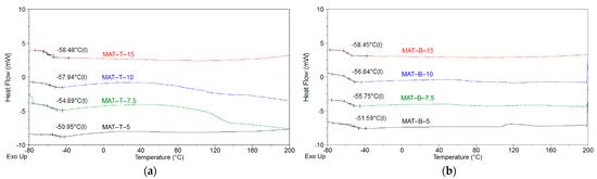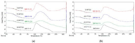 DSC thermographs for UV-crosslinked SATs based on MAT-T (a) or MAT-B (b).