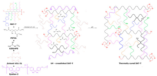 As can be seen, only the SATs-B with low-to-medium BTChM content (5, 7.5, or 10 wt. parts) and SAT-T-5 (5 wt. parts of TBM) exhibited acceptably low Tg values (from −23 to −20 °C). Generally, the higher the telogen concentration in SATs, the higher the Tg values of the system were (this relation was especially observed for SATs-T). This shows that SATs based on MATs with relatively lower molecular weights (i.e., with lower K-values) exhibited higher Tg values. This phenomenon is opposite to that observed for the reference MAT solutions (the Tg decreased with increasing telogen content and decreasing molecular weight value). The key difference is that the SATs were compounded using solid epoxy resin (ER) and a triacrylate component (PETIA), and they were UV crosslinked. The latter process caused the formation of a semi-interpenetrating polymer network (consisting of the thermoplastic ER and a MAT/PETIA-based 3D-type web structure) (Figure 4). Arguably, the UV crosslinking of the adhesive compositions containing MATs (with the relatively lower viscosity and molecular weight values) was more effective than that of the other systems. Thus, more dense acrylate polymer networks were formed; this resulted in lower mobility of linear parts of the networks and high Tg values.