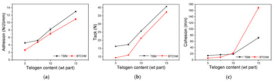 Adhesion to steel (a), tack (b), and cohesion (c) of SATs in relation to the type and content of their telogens.