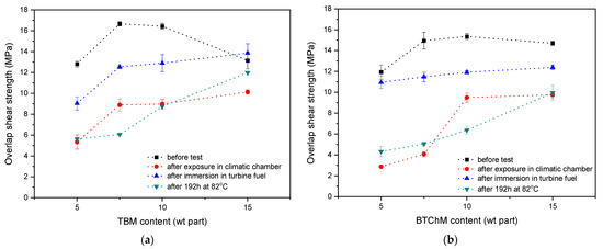 The UV-crosslinked SATs were applied between aluminum panels and thermally cured at 170 °C for 60 min. Additionally, the prepared Al/SAT/Al joints were thermally aged, immersed in turbine fuel, or exposed in a climatic chamber. Overlap shear strength (τ) values for the joints are presented in Figure 7. Generally, τ of the initial joints (i.e., after thermally curing, no aging) was higher than the value required for structural adhesives according to the ASTM standard (7 MPa).