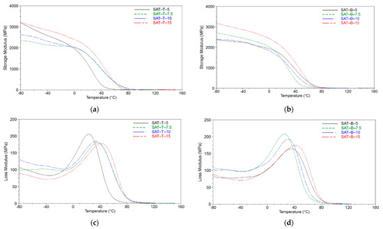 The thermally cured SATs were tested for their thermomechanical properties using the DMTA Q800 analyzer (TA Instruments, New Castle, DE, USA). The SAT sheets were cut into coupons with dimensions of ca. 50 × 10 mm; the final samples (total thickness of 2 mm) were prepared via a coupon-by-coupon assembly method. The test was performed using a dual cantilever (a flexural mode) at temperatures from −80 to 160 °C (heating rate of 2 °C/min). The deformation frequency was 1 Hz.