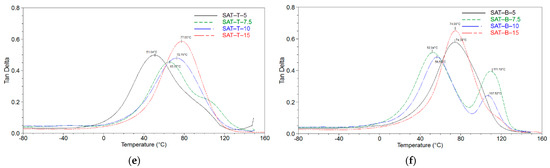Storage module (a,b), loss module (c,d), and tan delta (e,f) for thermally cured SATs based on MATs.