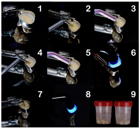 Restorative procedure of the experimental groups, where: (1) application of matrix band, (2) application of the primer, (3) drying step, (4) application of the bond (adhesive), (5) air thinning, (6) light-curing, (7) composite build-up, (8) light-curing in 2 mm increments, and (9) storage of the specimens.