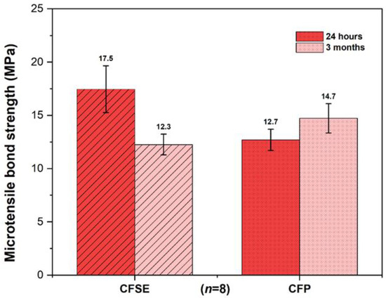 Regarding failure analysis in microtensile bond strength testing, in all groups, the majority of the failures were adhesive (Table 4), both after 24 h and 3 months. These results are in fact predictable in this typology of testing that focused on CFP, as previously reported [23,49].