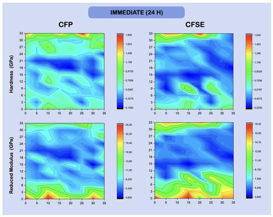 Hardness and reduced Young’s modulus (GPa) maps, showing the variation in intensity Figure 3. Random variation of hardness values can be seen in the CFSE group, while the reduced modulus shows distinguishable dentine features on the bottom layer (maps are representative of one random sample).
