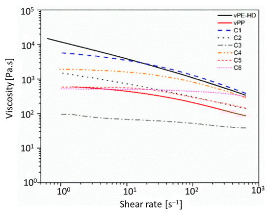 The measured shear rate dependence of melt viscosity curves of materials is provided in Figure 1.
