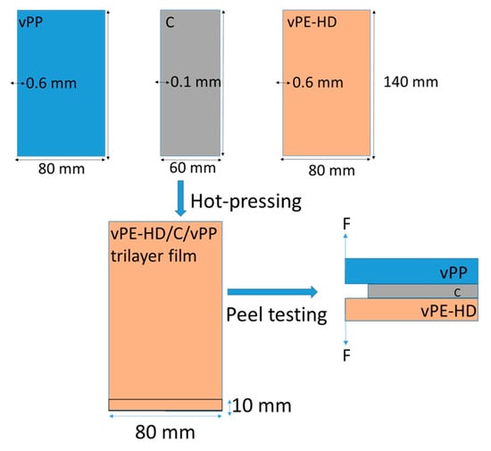 The adhesion of compatibilizer candidates to HDPE and PP were measured using peel testing. The sheets of HDPE with geometry of 140 mm × 80 mm × 0.6 mm, PP with geometry of 140 mm × 80 mm × 0.6 mm and compatibilizers with geometry of 140 mm × 60 mm × 0.1 mm were hot pressed at 190 °C by using a mold with a geometry of 140 mm × 80 mm, then sandwiched together (HDPE/Compatibilizers(C)/PP) and consequently once again hot pressed at 240 °C 30 s to simulate extrusion process. The hot press machine used was a Collin P 200 P heating press. The schematic representation of samples was shown in Figure 2.