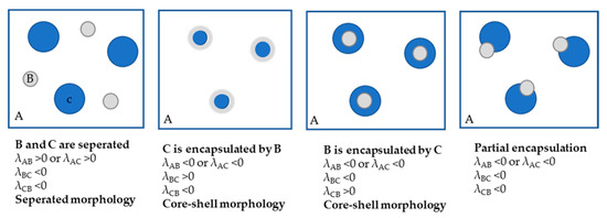 In the above equations, the λAB, λBC and λCB represent the spreading coefficients A over B, B over C and C over B, respectively. Based on the spreading coefficients, the phase morphology of ternary blends can be estimated. For the estimation of ternary blend morphology, a dispersed phase diagram (Figure 3) is generally used.
