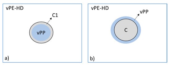 Conversely, the ternary blend of vHDPE/vPP with other compatibilizer candidates, such as propylene-based olefin block copolymer (C2), ethylene-propylene random copolymers (C3 and C4) and styrene-ethylene-butylene-styrene triblock copolymers (C5 and C6), is encapsulated by vPP according to spreading coefficient theory due to the λC1/vPP < 0, λvPP/C1 > 0 and λvHDPE/C1 = λvHDPE/vPP < 0, as illustrated in Figure 4.