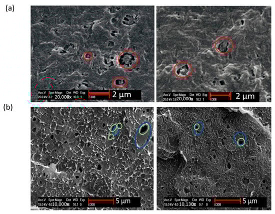 The SEM images of 10 wt% vPP contaminated vHDPE/vPP blend with 5 wt% of ethylene-propylene random copolymer (C3) are shown in Figure 5b. One can see that the ethylene-propylene-random copolymer was etched, as seen on the dark particles marked with green circles. The etched ethylene-propylene-random copolymer particles are located in dispersed PP particles (blue circles), which confirms the predicted morphology in Figure 4b.