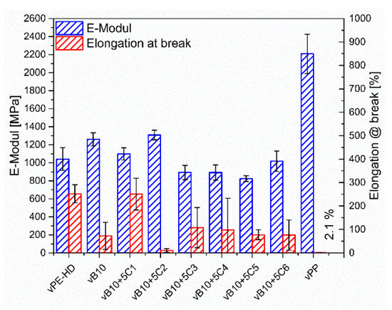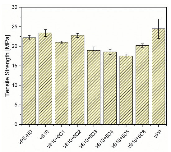 The effects of adding 5 wt% of various compatibilizer candidates to 10 wt% vPP contaminated vHDPE (vB10 model blend) on tensile properties were investigated. The tensile test results of vHDPE, vPP, vB10 and vB10 with 5 wt% of six different compatibilizer candidates (C1, C2, C3, C4, C5 and C6) are provided in Figure 7.