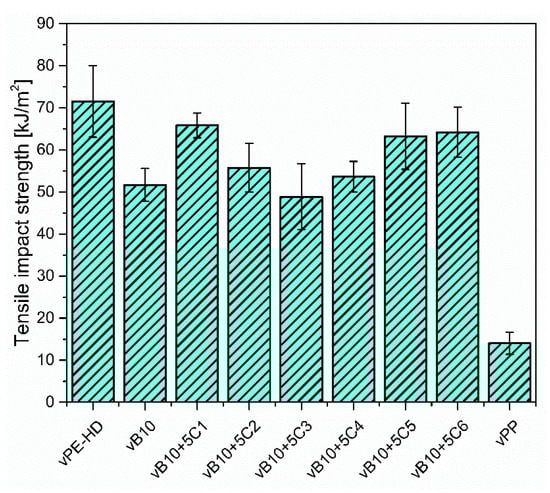 In addition to the tensile testing, the tensile impact testing provides important information regarding impact resistance under dynamic load. The tensile impact strength results of vHDPE, vPP, vB10 and vB10 blended with 5 wt% of different compatibilizers are shown in Figure 9.