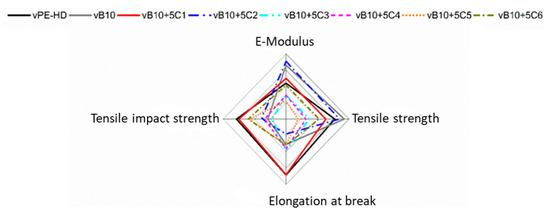 The increasing in elongation at break as well as impact strength is a significant evident for enhancement of phase adhesion and successful compatibilization, as reported in the literature [,,,,]. Consequently, the successful compatibilization of 10 wt% vPP contaminated vHDPE (vB10 blend) is only achieved with 5 wt% addition of the ethylene-based olefin block copolymer (C1) due to the improvement in elongation at break and tensile impact strength. In other words, the modification of 10 wt% vPP (injection molding grade) contaminated vHDPE (blow molding grade) blend (vB10) with 5 wt% of ethylene-based olefin block copolymer (C1) yielded a material with mechanical properties very close to neat vHDPE, as illustrated in radar charts in Figure 10. The obtained results from tensile as well as tensile impact tests virgin model blends highlighted that ethylene-based olefin block copolymer (C1) can be used as a compatibilizer in order to improve impact resistance of rHDPE-rich-rHDPE/rPP blend from recycled post-consumer detergent bottle waste.